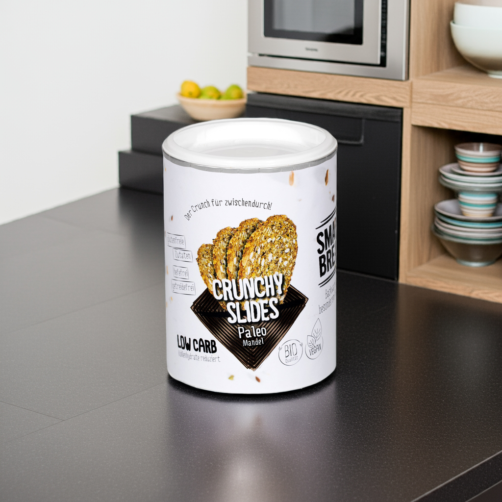 Unsere Crunchy Slides – Paleo Mandel bestehen zu 100 % aus dem bewährten Teig unseres beliebten „Paleobrots Mandel“ – komplett getreidefrei und glutenfrei. Nach dem Backen werden die hauchdünnen Scheiben von unserem Bäckermeister sorgfältig getrocknet. So bleiben wertvolle Nährstoffe erhalten und die Slides bekommen ihre unwiderstehlich knusprige Konsistenz.